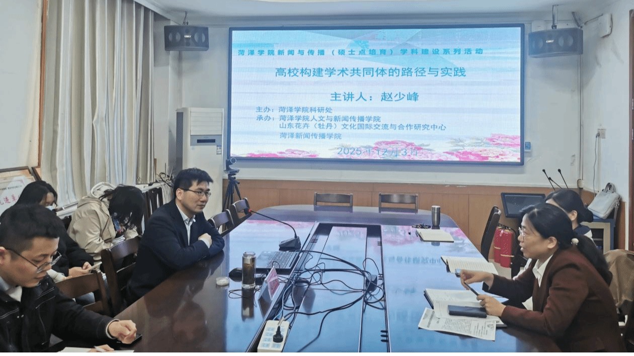 为进一步深化高校学术共同体构建实践,打破学科壁垒、凝聚科研合力,推动学校高质量发展,12月3日,人文与新闻传播学院和山东省外事研究与发展智库山东花卉(牡丹)文化国际交流与合作研究中心特邀聊城大学历史文化与旅游学院院长、太平洋岛国研究中心主任、区域国别研究院执行院长赵少峰教授于1号楼225会议室作“高校构建学术共同体的路径与实践”学术报告。报告会由人文与新闻传播学院院长邵瑞教授主持,科研处副处长刘玉丽教授、人文与新闻传播学院教师、山东花卉(牡丹)文化国际交流与合作研究中心、山东省与环印度洋国家交流合作研究中心相关老师和和学生代表参加。